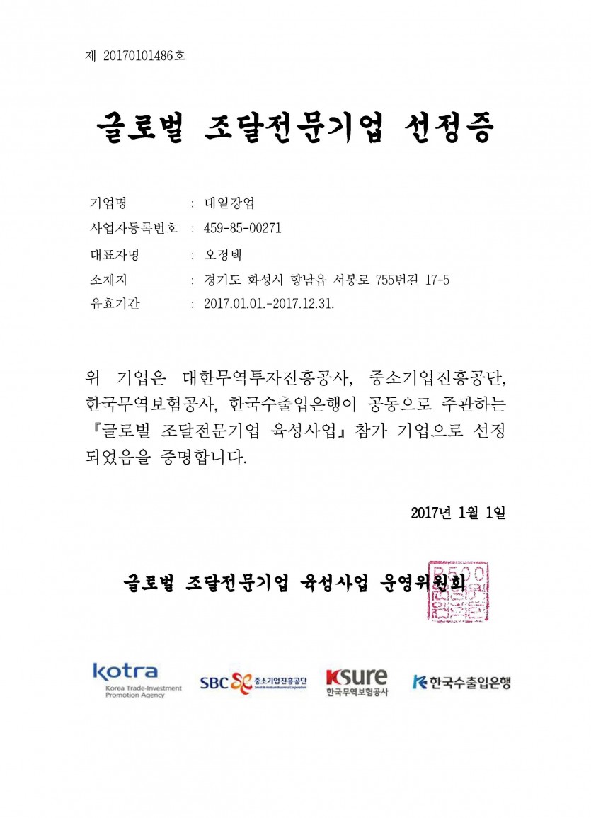 글로벌 조달 전문기업 선정(인증서) 글로벌 조달 전문기업 선정(인증서) 목록 답변 이전글경영혁신형 중소기업(인증서) 22.09.06 다음글ISO 9001-2015(인증서) 22.09.06
